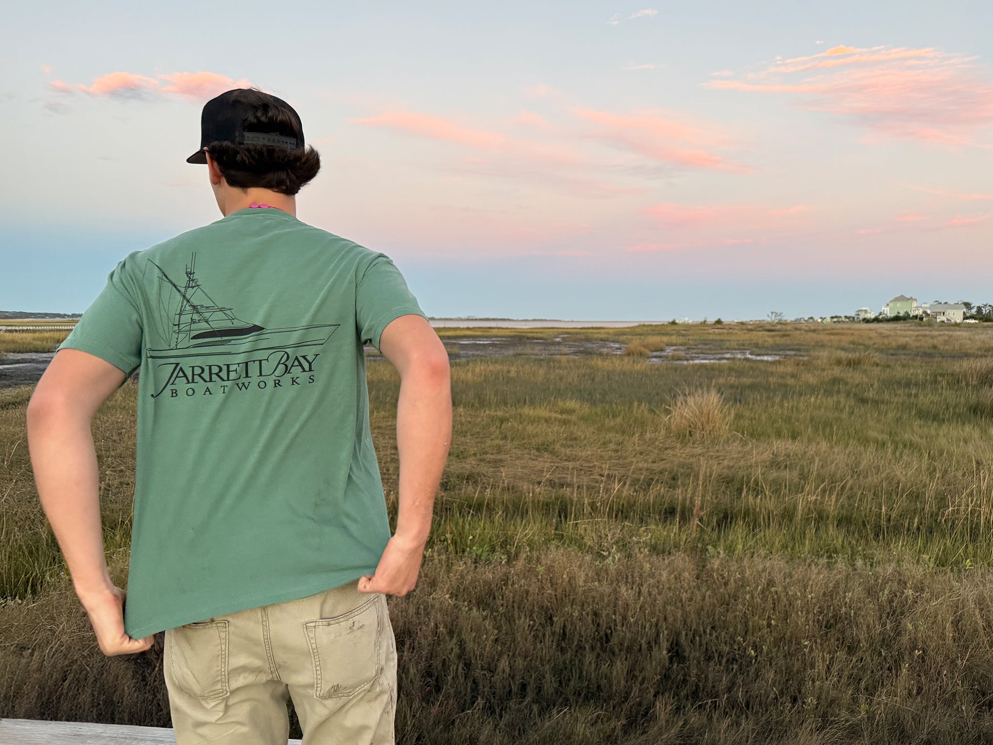 Our Jumping Marlin tee features hull no. 5 and hull no. 65, showcasing our boat building traditions and also progress!