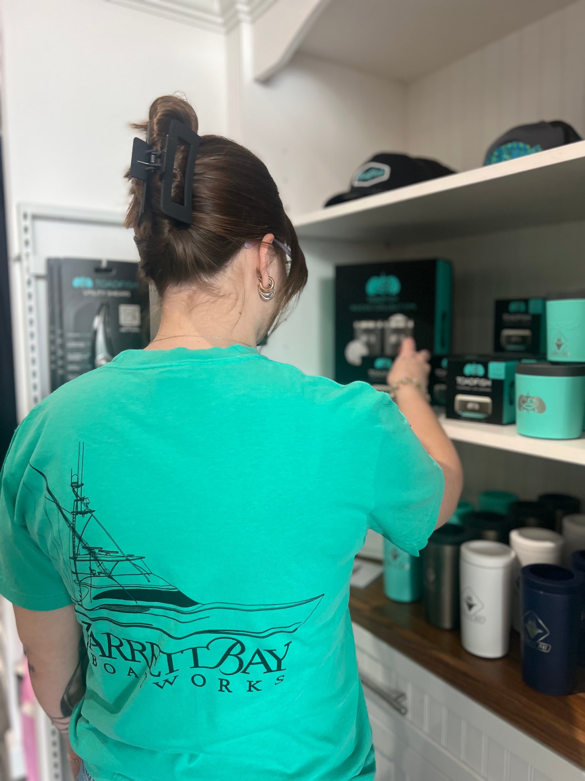 Our Jarrett Bay Offshore Pursuit tee features everything boating enthusiasts love- a Jarrett Bay sportfisher, plenty of fish, and our Cape Lookout Ligthhouse!